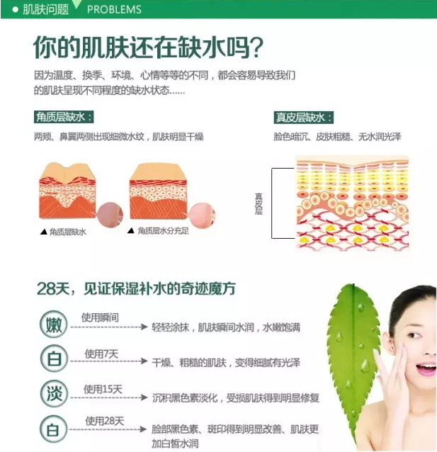 皮肤缺水、缺油、易长皱纹、色斑;容易老化、干燥、无光泽、肌肉松弛缺乏弹性、眼袋、色素增多、有鱼尾纹、面部皱纹。