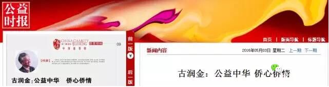 在中国投资20多年来,古润金带领完美公司诚信经营、依法纳税,在为消费者提供优质产品及服务、为经销商提供事业发展机会的同时,继承孙中山先生的博爱精神,坚持“取之社会,用之社会”的公益理念,积极履行社会责任,热心公益慈善事业,全力促进“华人世界和谐共进”。