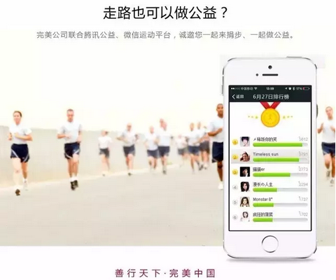 今年7月,完美公司与腾讯公益“益行家”平台合作推出“你走路,我捐款”活动。在每日的捐赠额度内,网友每走1万步,企业就相应捐1元,“捐步”活动在朋友圈引发了“爱心赛跑”。