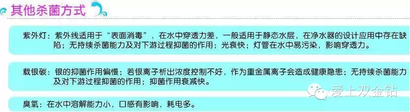 注:国内其他品牌净水机一般采用:载银活性炭、臭氧、紫外线灯管杀菌等,存在穿透性差、耗电、杀菌不彻底等缺陷!甚至造成细菌二次污染!