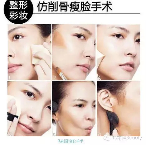 彩妆技巧:以深色粉底液和修容粉饼制造阴影,针对颧骨和下颚骨明显的脸型来修饰,调整脸型后达到小脸效果。