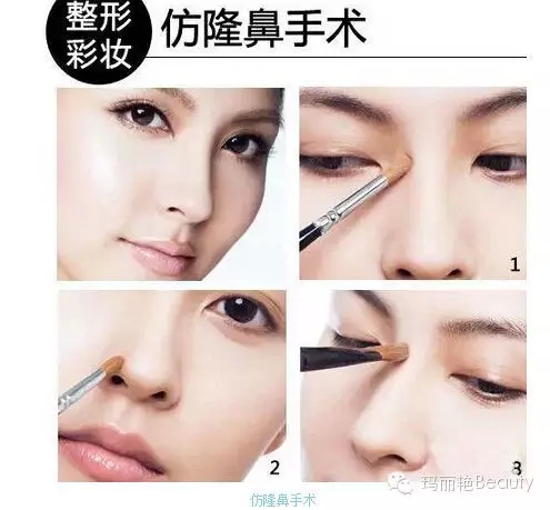彩妆技巧:以深色加强鼻梁两侧阴影,并打亮鼻梁突起处,修饰出高挺的鼻梁,至于鼻头和鼻翼较宽的人,同样可以用深色修饰,打造出较秀气的鼻型。