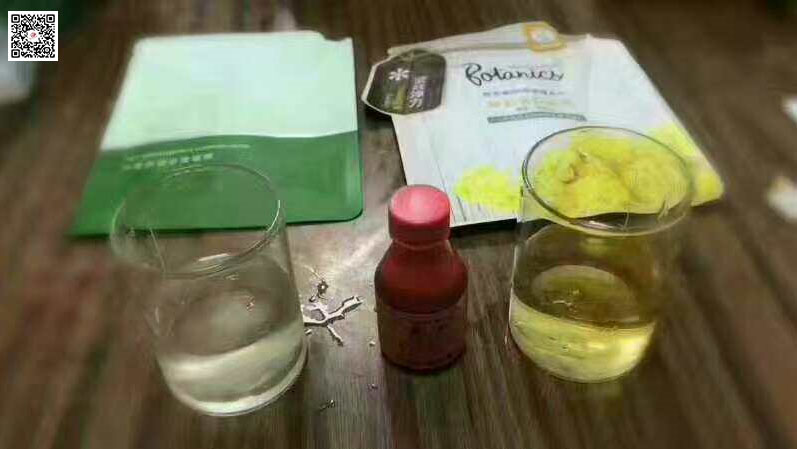 第三步,我们将两种面膜的原液等量倒入两个水杯里,我们来看5分后,放入完美面膜原液的水杯里的水已经从最初的黄色变成了透明的颜色-如图,️而其它品牌的面膜原液没有改变水杯内的液体颜色,这又说明了什么呢