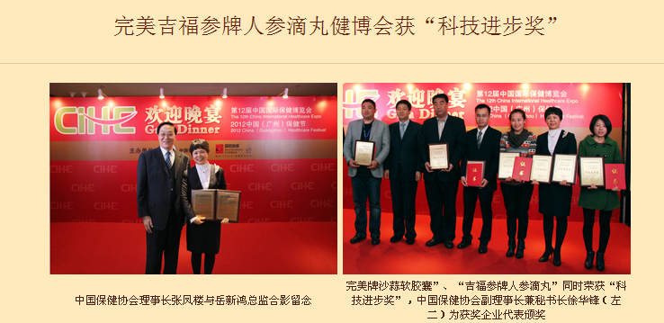 近日,完美保健品吉福参牌人参滴丸喜获第12届中国国际保健博览会“科技进步奖”。完美公司业务发展部岳新鸿总监代表公司出席在广州琶洲国际会展中心举行了第12届中国国际保健博览会/2012(中国)广州保健节欢迎晚宴暨年度颁奖典礼。