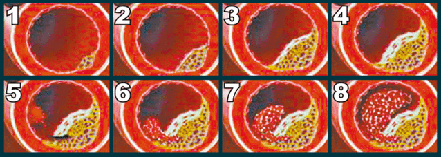 大量脂类物质蛋白,在血浆中沉积移动,降低血液流速,并通过氧化作用酸败后沉积在动脉血管内皮上,并长期黏附在血管壁上,损害动脉血管内皮,形成血管硬化。