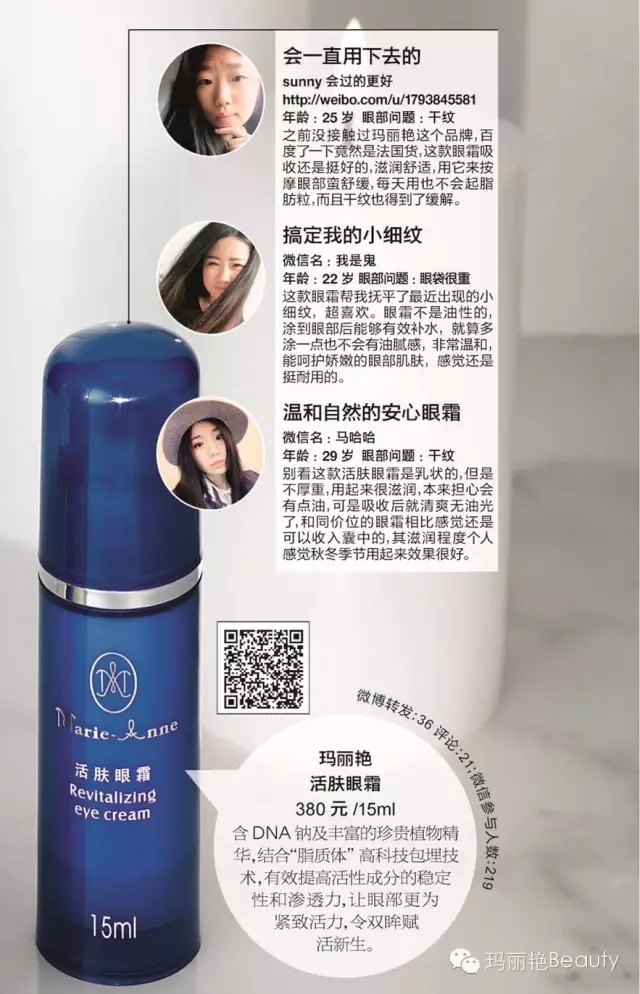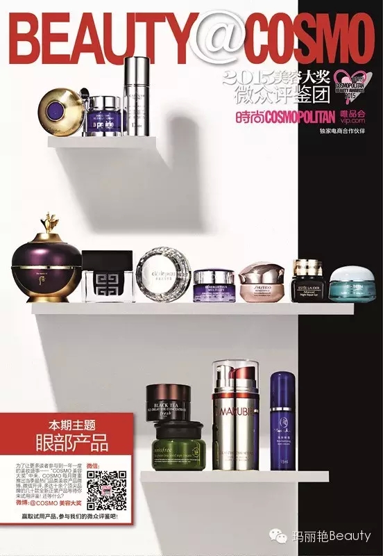 玛丽艳活肤眼霜获国内外知名杂志《时尚COSMO》美容编辑力荐,经过专家和达人试用和推荐,荣登杂志美容大奖微众评鉴团!