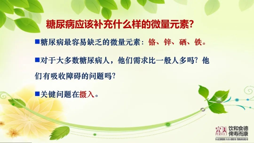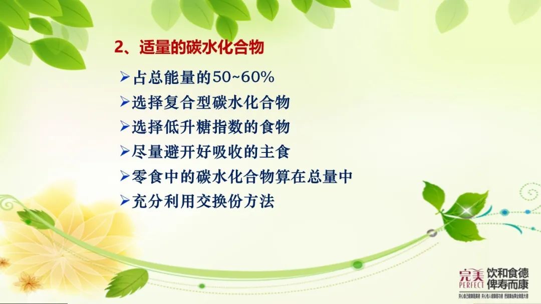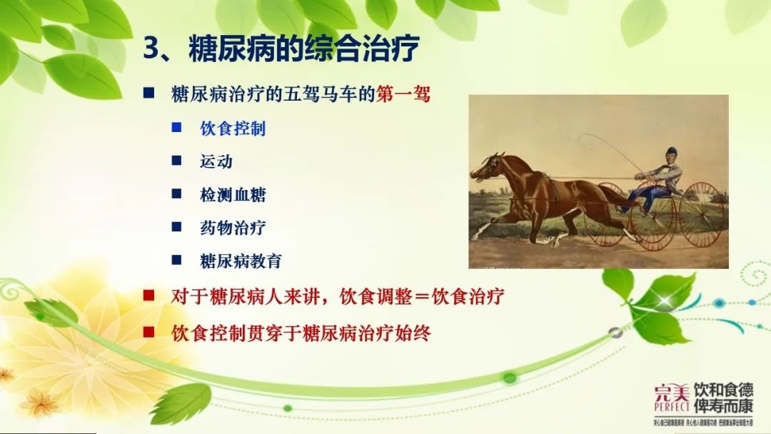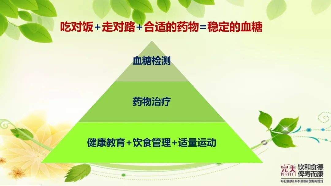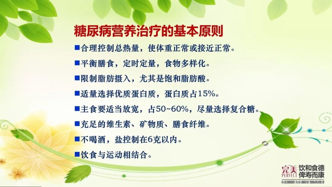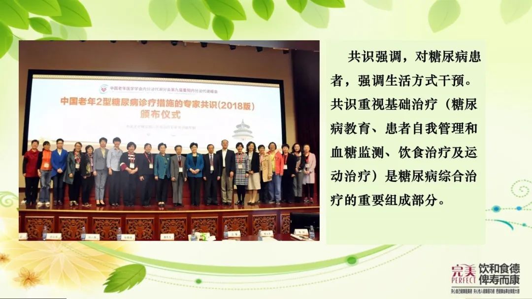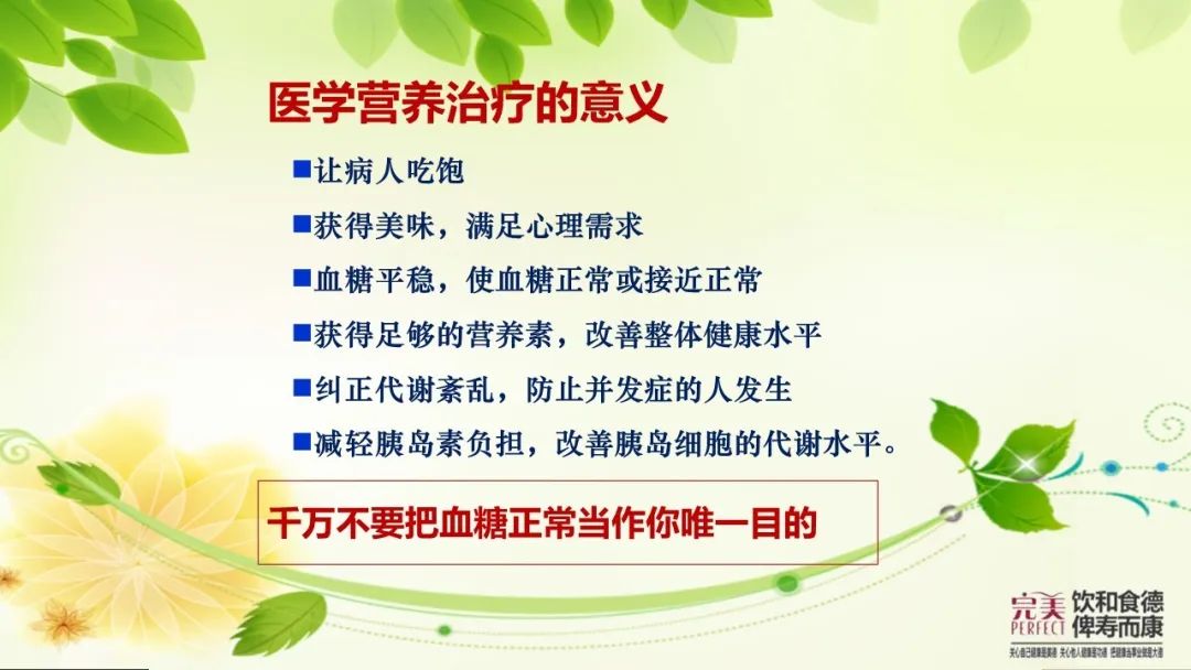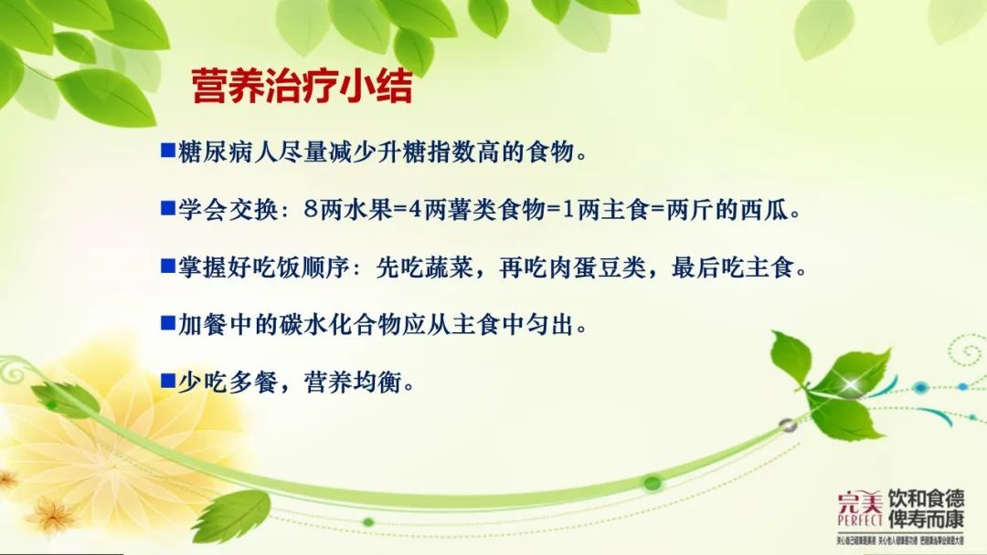 其中,于爱芹总监提到:吃对饭+走对路+合适的药物=稳定的血糖;糖尿病人尽量减少升糖指数高的食物;学会交换:8两水果=4两薯类食物=1两主食=两斤的西瓜;掌握好吃饭顺序:先吃蔬菜,再吃肉蛋豆类,最后吃主食;加餐中的碳水化合物应从主食中匀出;少吃多餐,营养均衡,才是正确的营养治疗方法。