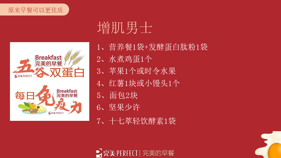 蛋白质:必选。蛋白质是身体新陈代谢的必需品。肉蛋奶类食物都是不错的选择。
