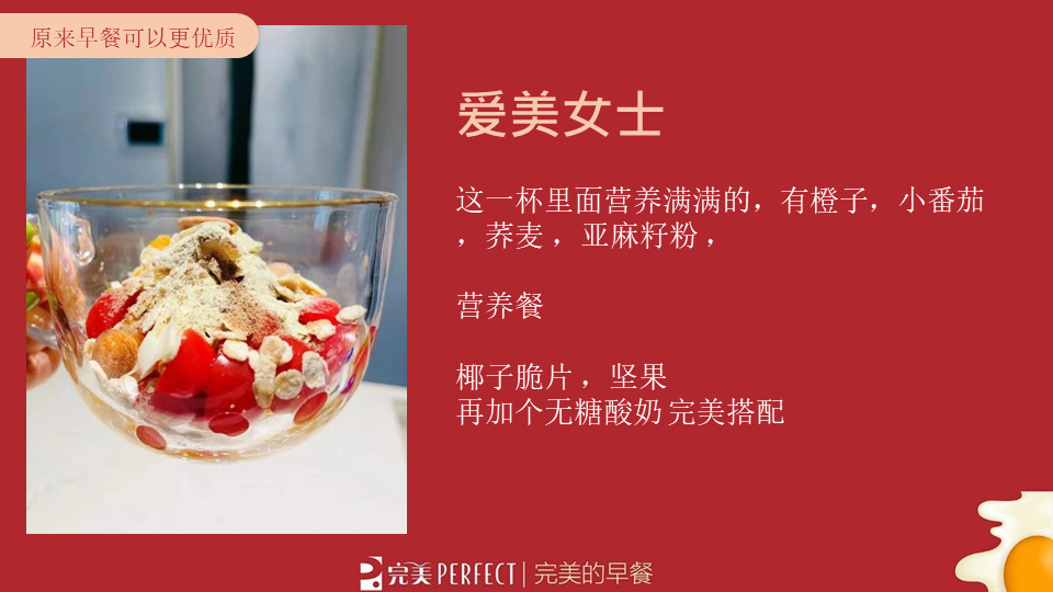 这一杯里面营养满满的,有橙子,小番茄 ,荞麦 ,亚麻籽粉 ,营养餐,椰子脆片 ,坚果再加个无糖酸奶 完美搭配。