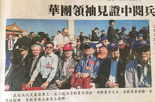 在阅兵仪式现场,古董事长和其他侨界代表一起为今天的中国加油喝彩,并表示,大阅兵所展示的中国伟大成就和强大综合国力,让身为第三代海外华人的自己备受鼓舞,而这种归属感和自豪感比以往任何时候都更强烈。一直以来,海外侨胞非常关心和关注祖(籍)国的发展,同时也在通过自己的努力,积极参与和支持中国各项事业的建设,促进中外民间友好交流。新时期,海外侨胞应铭记历史、缅怀先烈、珍爱和平、开创未来,继续发扬中华民族优良传统,坚定理想和信念,团结一致为实现伟大复兴中国梦而不懈奋斗。