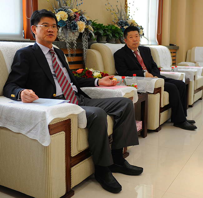 完美(中国)有限公司总裁胡瑞连(左)与吉林吉福参生物开发有限公司副总裁王玉良接受记者采访 新华社记者高楠摄。