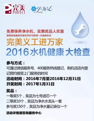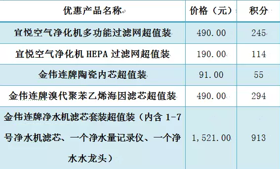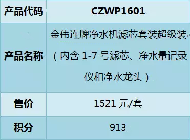 根据公司销售系统的记录,于2016年9月1日前,凡购买过金伟连牌净水机的老顾客以正价五折限购一套金伟连牌净水机滤芯套装超值装。