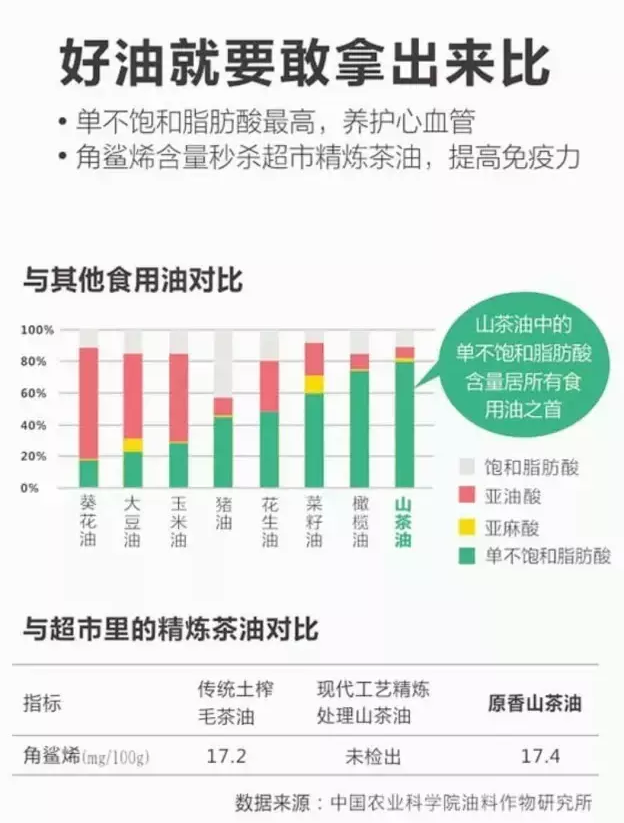 与其它食用油相比,山茶籽油的单不饱和脂肪酸——油酸的含量是所有植物油中最高的,其它饱和脂肪酸与多不饱和脂肪酸含量相当少。我们知道,食用油中饱和脂肪酸较高,容易引起高血脂、心血管疾病,而多不饱和脂肪酸中欧米伽-3与欧米伽-6的比例不协调会造成人体各种疾病与亚健康。由此看来,山茶籽油有着其独特的成分优势,为其它食用油所无法取代。