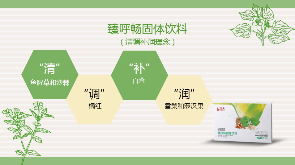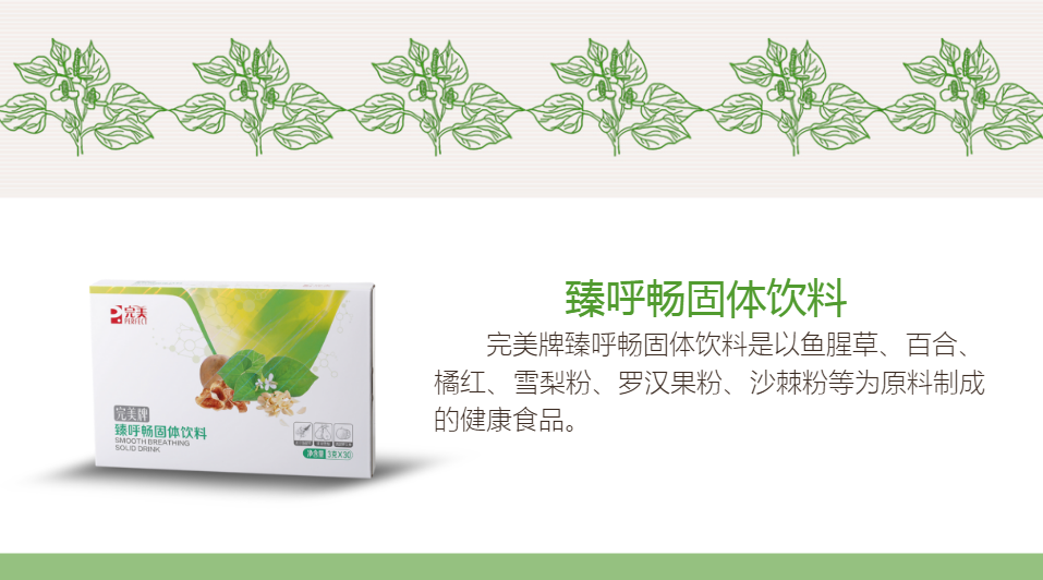 完美牌臻呼畅固体饮料是以鱼腥草、百合、橘红、雪梨粉、罗汉果粉、沙棘粉等为原料制成的健康食品。
