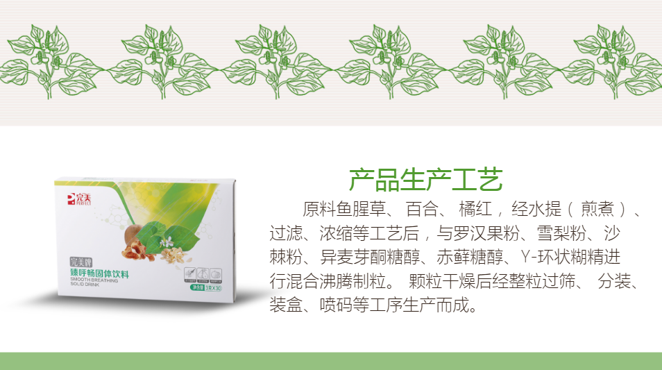 原料鱼腥草、百合、橘红,经水提(煎煮)、过滤、浓缩等工艺后,与罗汉果粉、雪梨粉、沙棘粉、异麦芽酮糖醇、赤藓糖醇、Y-环状糊精进行混合沸腾制粒。颗粒干燥后经整粒过筛、分装、装盒、喷码等工序生产而成。
