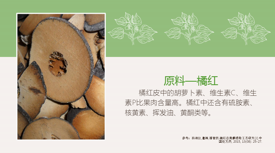 橘红皮中的胡萝卜素、维生素C、维生素P比果肉含量高。橘红中还含有硫胺素、核黄素、挥发油、黄酮类等。
