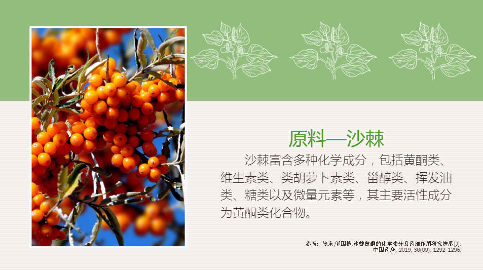 沙棘富含多种化学成分,包括黄酮类、维生素类、类胡萝卜素类、甾醇类、挥发油类、糖类以及微量元素等,其主要活性成分为黄酮类化合物。