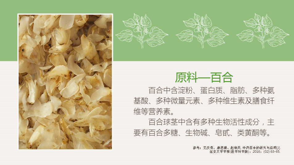 百合球茎中含有多种生物活性成分,主要有百合多糖、生物碱、皂甙、类黄酮等。