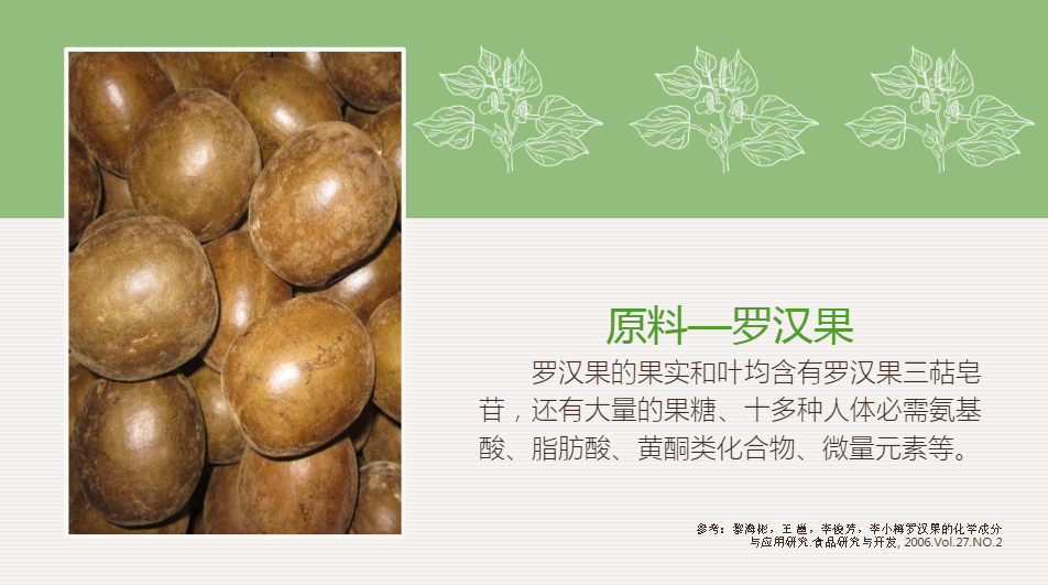 罗汉果的果实和叶均含有罗汉果三萜皂苷,还有大量的果糖、十多种人体必需氨基酸、脂肪酸、黄酮类化合物、微量元素等。