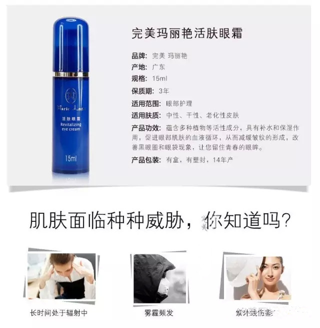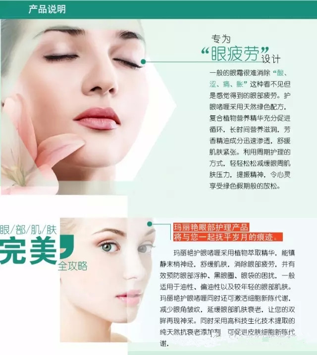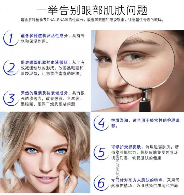 眼部肌肤嫩薄而敏感,其护理也自然有别于面部其它部位,它要求更加细腻。以前,很多人将面霜涂在眼部,使得其中的油性成分沉积于眼部皮肤下面,形成很难消除的白色脂肪粒,并导致肌肤过早老化,幸好专业养护的眼霜应运而生,并得到迅速发展,使眼部护理变得轻松。我们向您推荐—