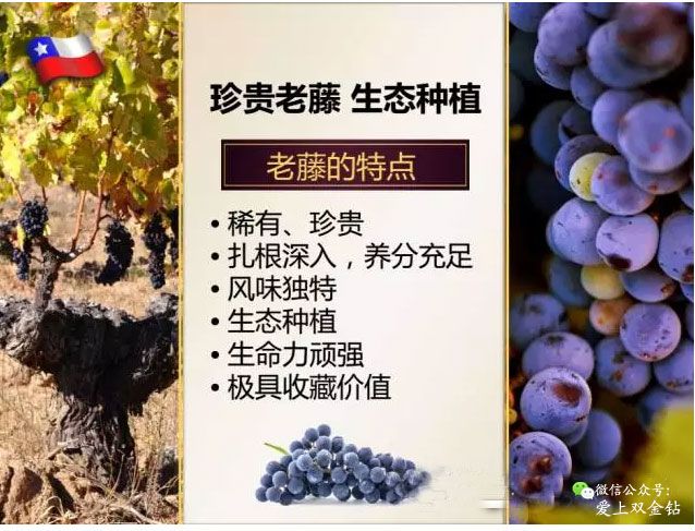 1、由赤霞珠和佳美娜两个品种的老藤葡萄酿制而成;