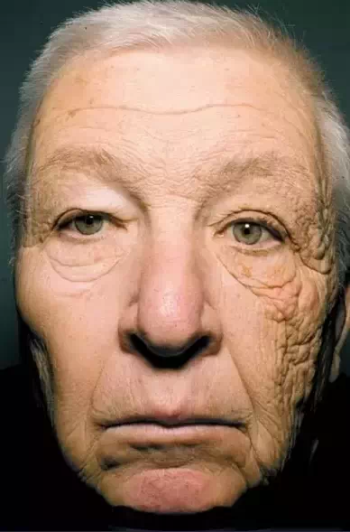 20年的测试,左脸坚持保养,右脸只是清洁,用一点滋润的面霜。