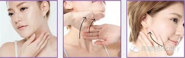 颈部按摩。按摩不失是避免表皮下垂的好方法。先把下巴略为抬起,之后用食指、中指及无名指由近锁骨的位置起,由下往上用轻柔的力度按摩至下巴,继而用一样的手势按颈项两旁至耳畔的位置。