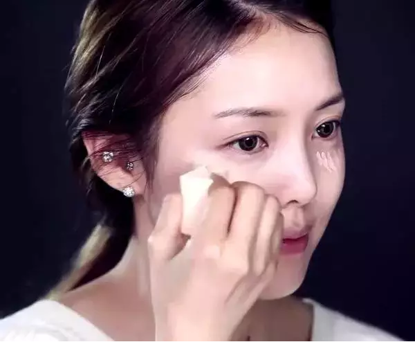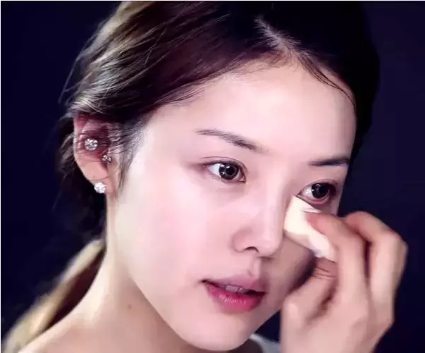 使用深色粉底遮去黑眼圈和泪沟,提亮眼下,打底遮瑕部分完成!