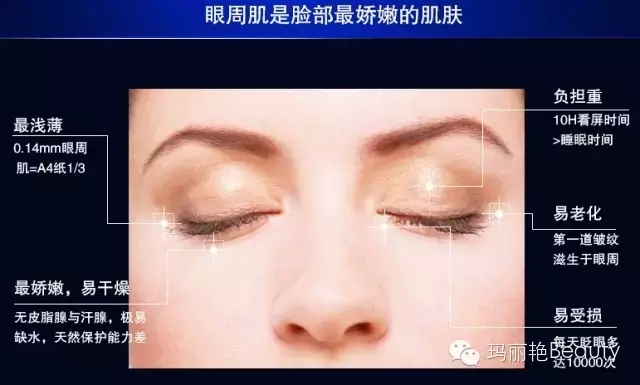 眼睛周围的皮肤特别柔细纤薄,并有许多的皱褶,故眼周肌肤水分蒸发速度较快;同时,眼周皮肤的汗腺和皮脂腺分布较少,特别容易干燥缺水。