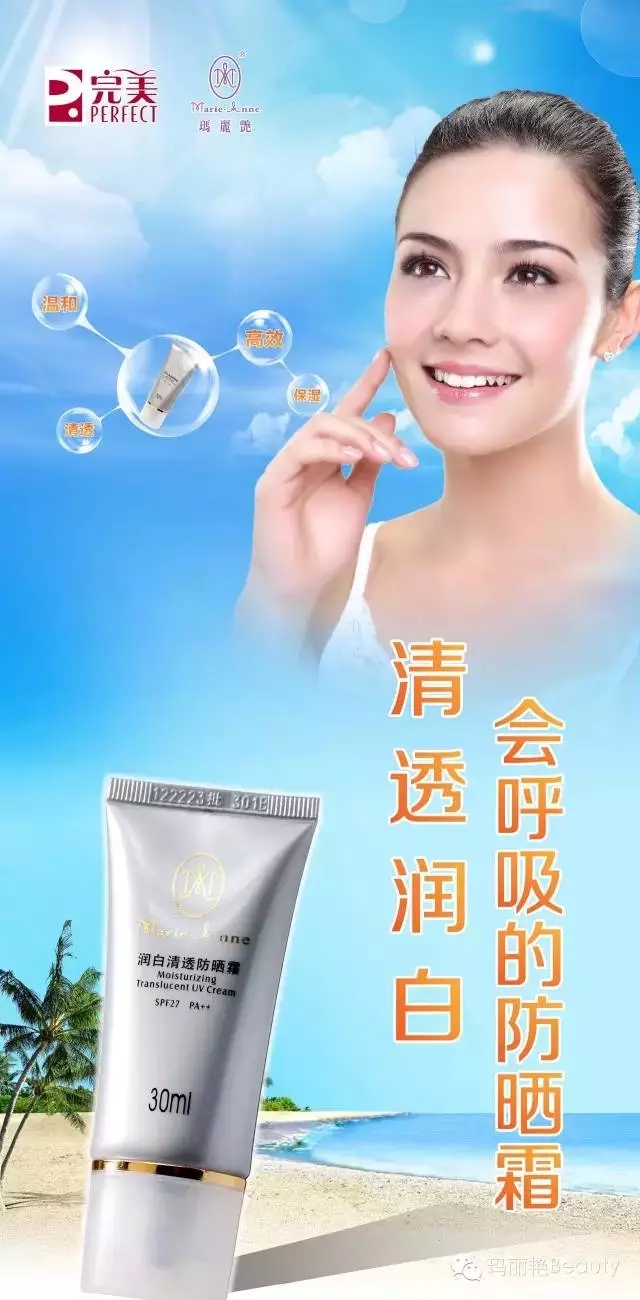 玛丽艳润白清透防晒霜,物理防晒剂配方,通过特有的无机防晒粉体分散技术,使防晒粉体均匀稳定,可更好地折射、散射紫外线;