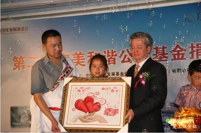 2011年,“侨心侨力·侨商公益——第二期完美和谐公益基金捐赠仪式”在京举行,四川九寨沟勿角乡完美永久抗震纪念希望小学师生代表来到发布会现场,向完美公司董事长古润金赠送了这幅《牵手》十字绣。