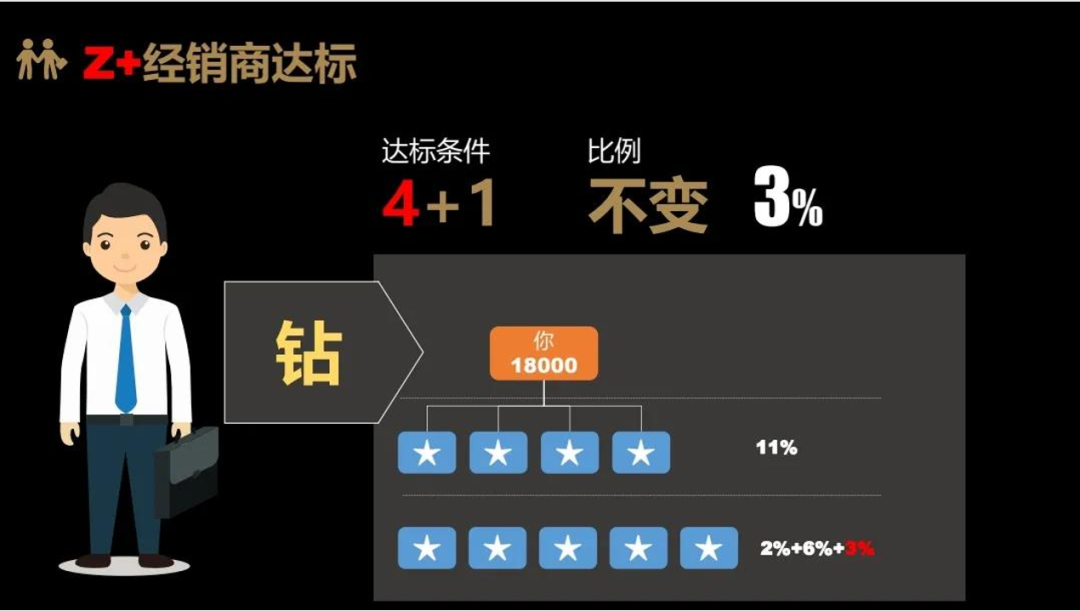 1、条件:个人卡消费300PV+培养横排4个合格直销员+个人小组18000PV。